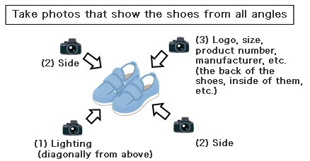 - Photos that make it possible to see the logo, size, product number, manufacturer, etc. (inside of the shoes, etc).