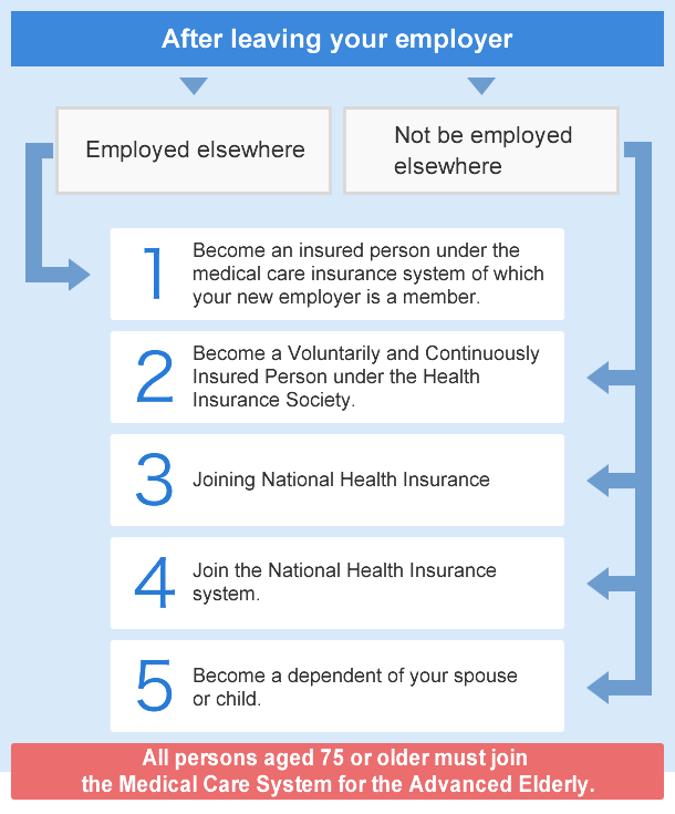 While you will lose your eligibility as an insured person under the health insurance system the day after you leave your employer, a system is available whereby you can remain an insured person under the Health Insurance Association if you meet certain conditions. This is known as the system for Voluntarily and Continuously Insured Persons.